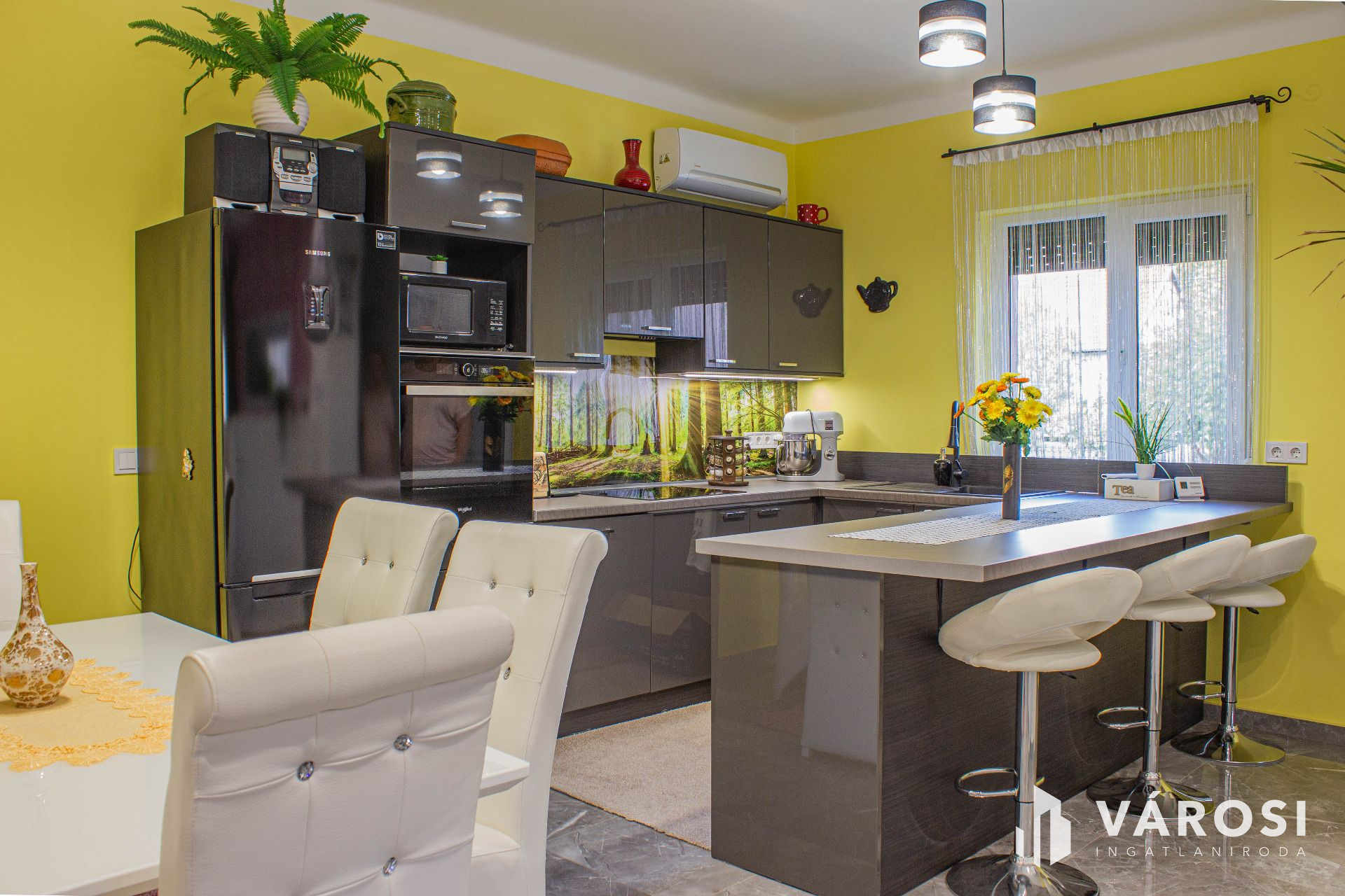 Ízlésesen kialakított, rendkívül világos, praktikus otthon. Az egyik szobában egy gardrobe is helyet kapott, ahová egy ajtón keresztül lehet belépni. Jelenleg egy kondenzációs kazán biztosítja a fűtést, de van lehetőség vegyes tüzelésű kialakítására is.