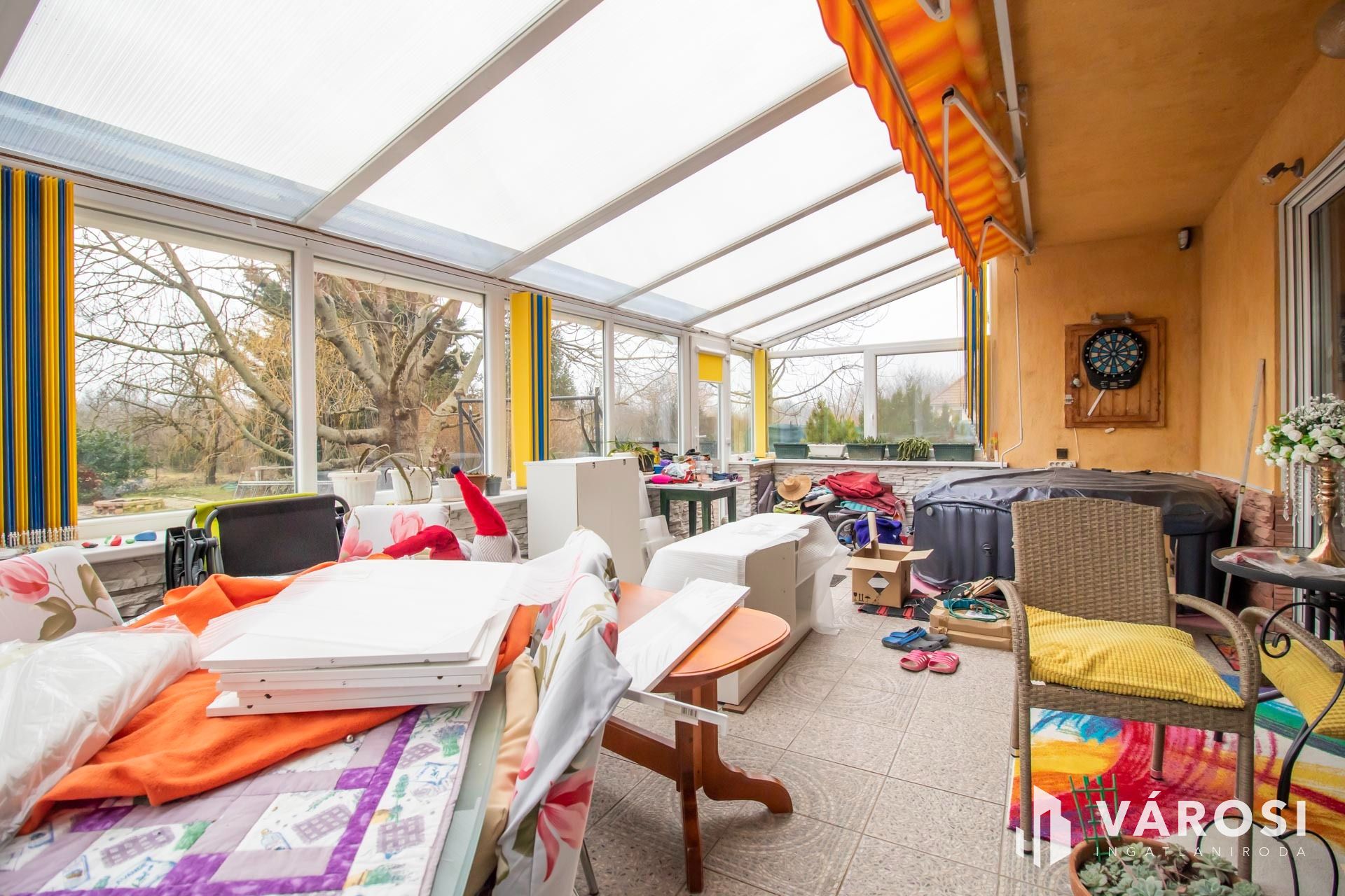 A Durisol hőszigetelt falazóelemből épült 115 négyzetméteres házban nappali, 3 szoba, konyha + étkező és 2 fürdőszoba és még egy külön wc kapott helyet. A ház alapterületébe nem számoltam bele, de rendelkezésre áll még egy teljesen körbeüvegezett, 25 négyzetméteres télikert is, ami szinte egész évben, a közösségi élet központja. Ideális hely például egy jakuzzi számára.