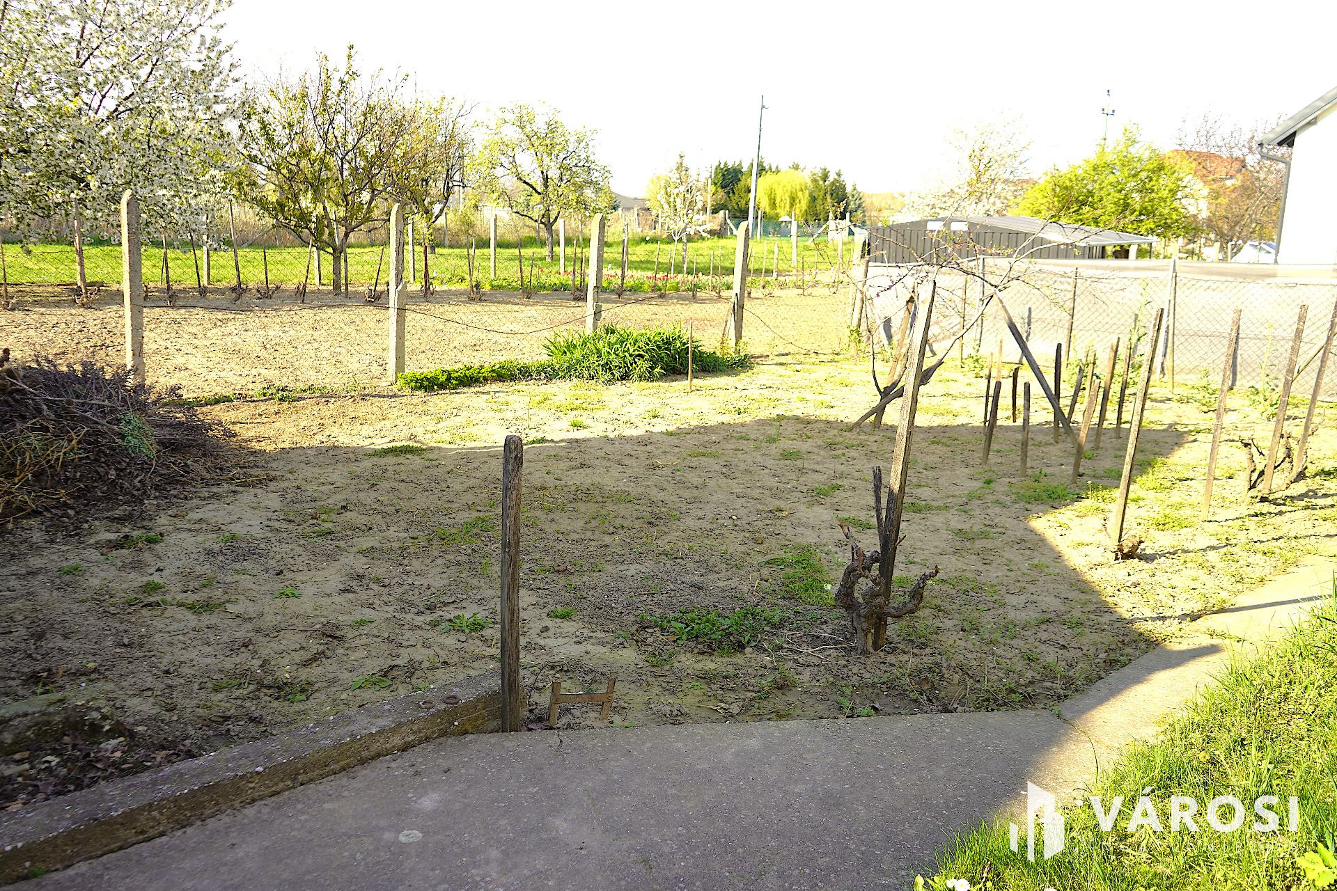A ház egy 730 m²-es telken helyezkedik el, amely bőven tartogat lehetőségeket a kert szerelmeseinek. A kertkapcsolat révén könnyedén kialakítható egy kellemes kültéri pihenőhely vagy konyhakert. A házhoz két különálló garázs tartozik, az egyik aknával rendelkezik. A házhoz műhely is tartozik, amivel szükség esetén az ingatlan lakótere nagyobbítható.