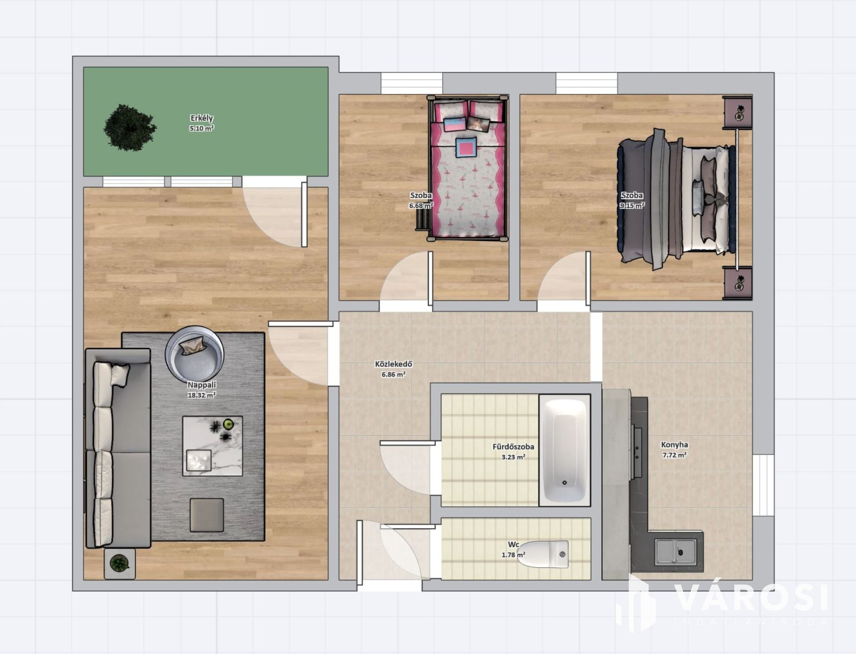 A lakás világos, praktikus elosztású: a szobákban laminált padló, míg a közlekedőben, konyhában, fürdőben és WC-ben hidegburkolat található.