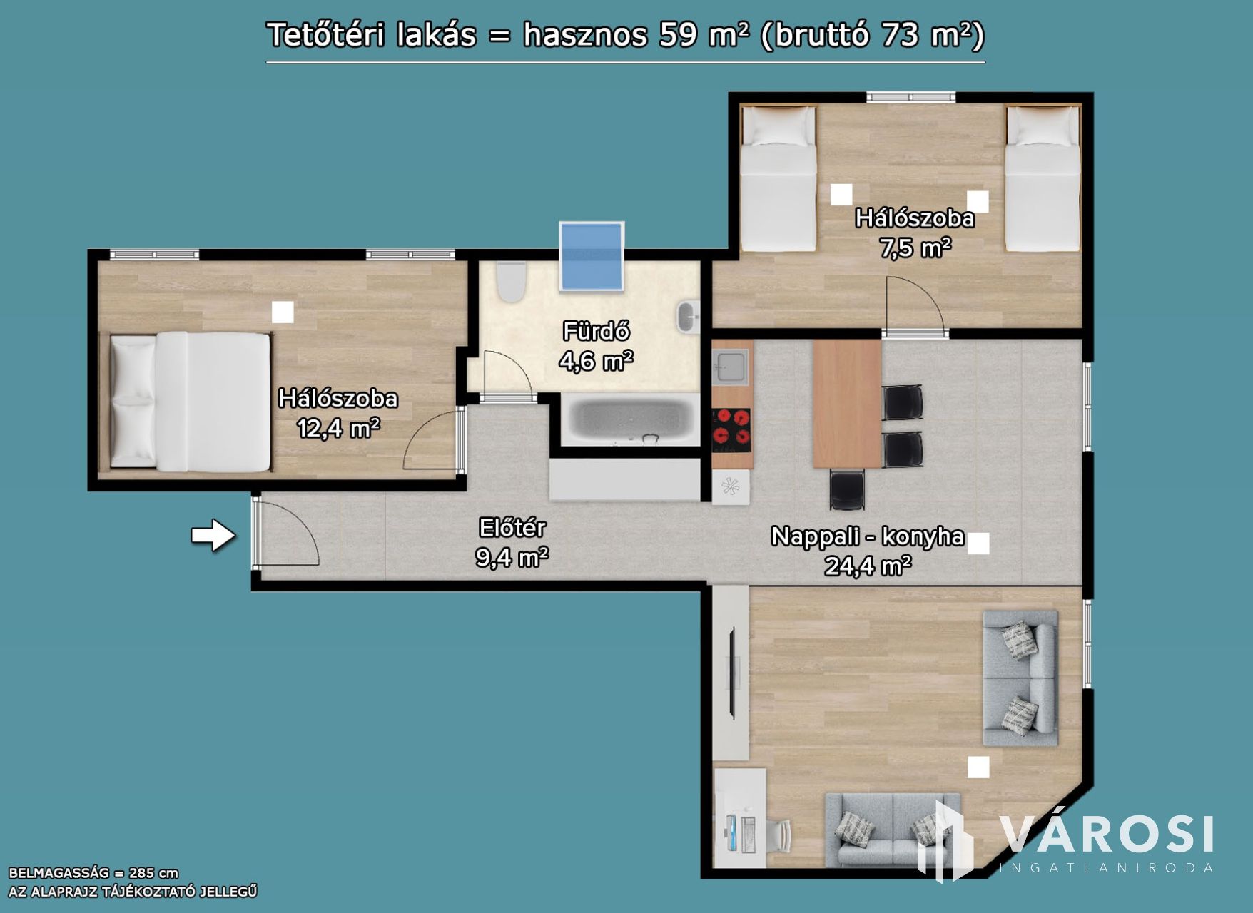 A lakás első emeleti, önálló helyrajzi számmal rendelkezik, nettó alapterülete 59 m2 (a bruttó 73 m2).