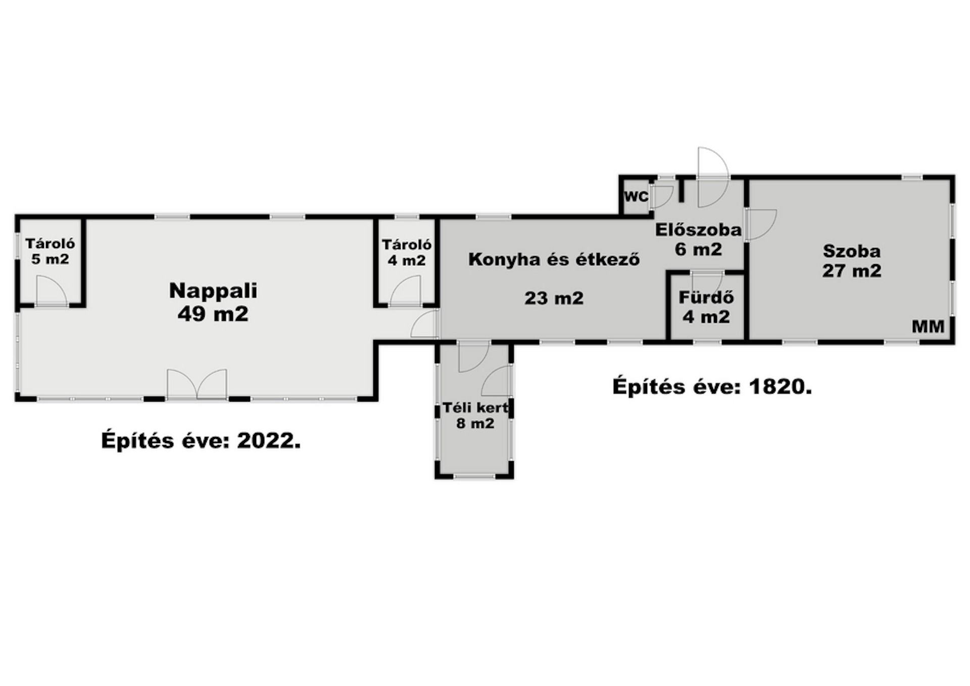 Az 58 m2-es új rész cserép borítással, műanyag nyílászárókkal, már tégla tégla falazattal épült, melyben egy kis lakás méretű nappali és két tároló kapott helyet.