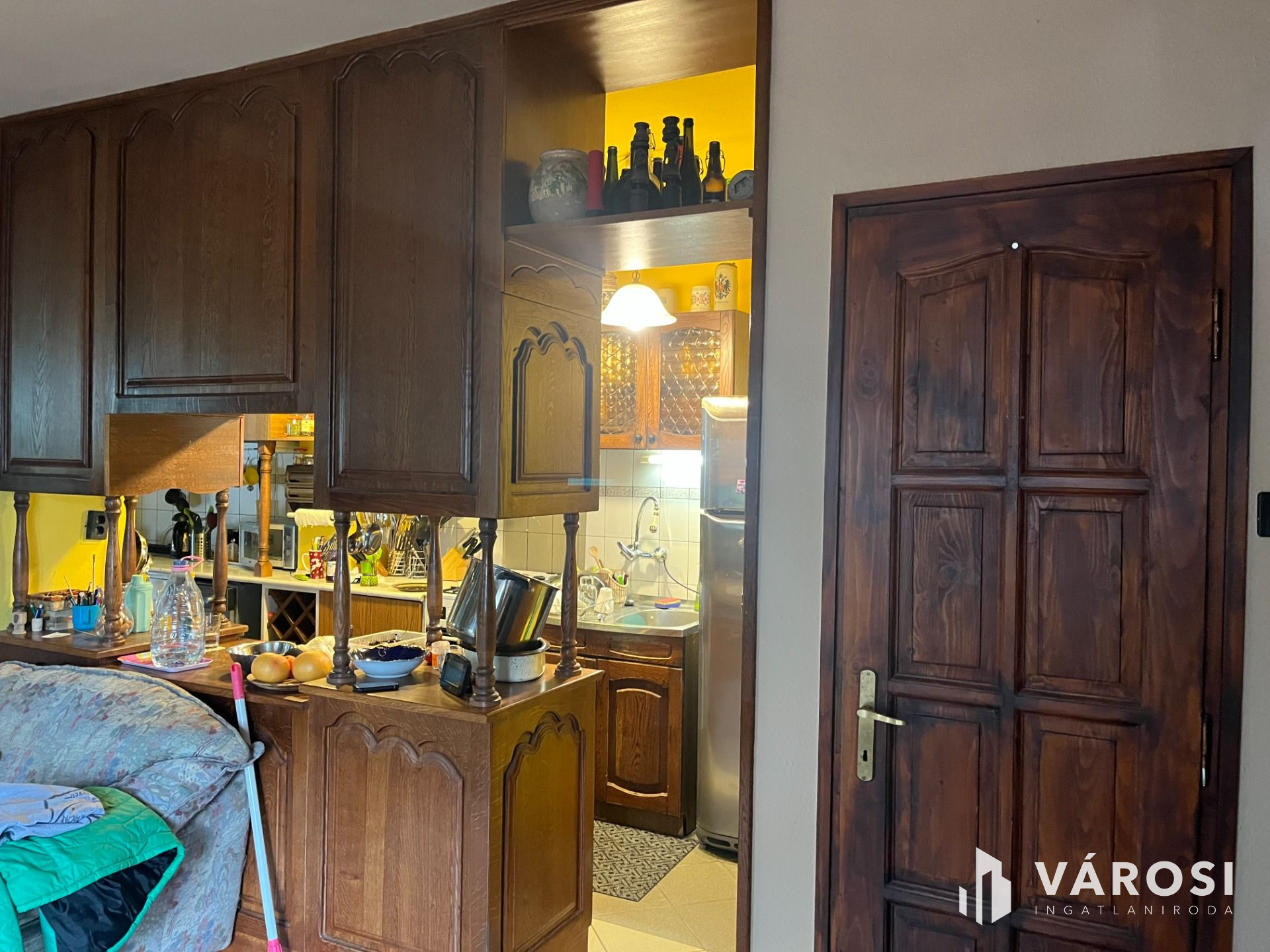 Konyhában átadópult van ami az étkezőben található bútorhoz lett csináltatva. Étkezőbe tömör tölgyfa asztal székekkel.