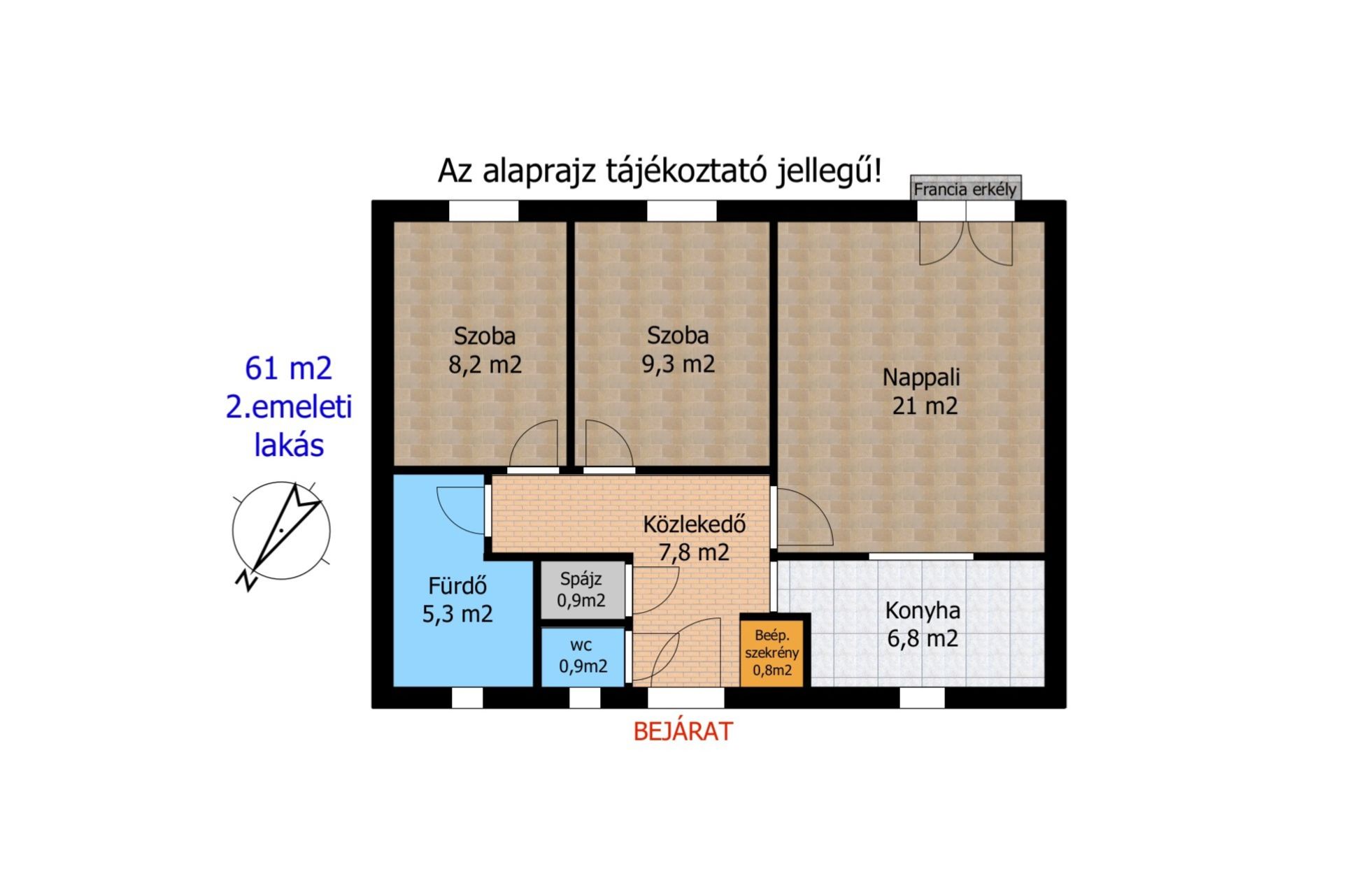 Az udvarra néző nappali + 2 szoba ablakai délkeleti fekvésűek; egyéb helyiségek konyha, spájz, közlekedő, fürdő külön wc, előszobában a bejárat mellett beépített gardrób, műanyag külső nyílászárók.