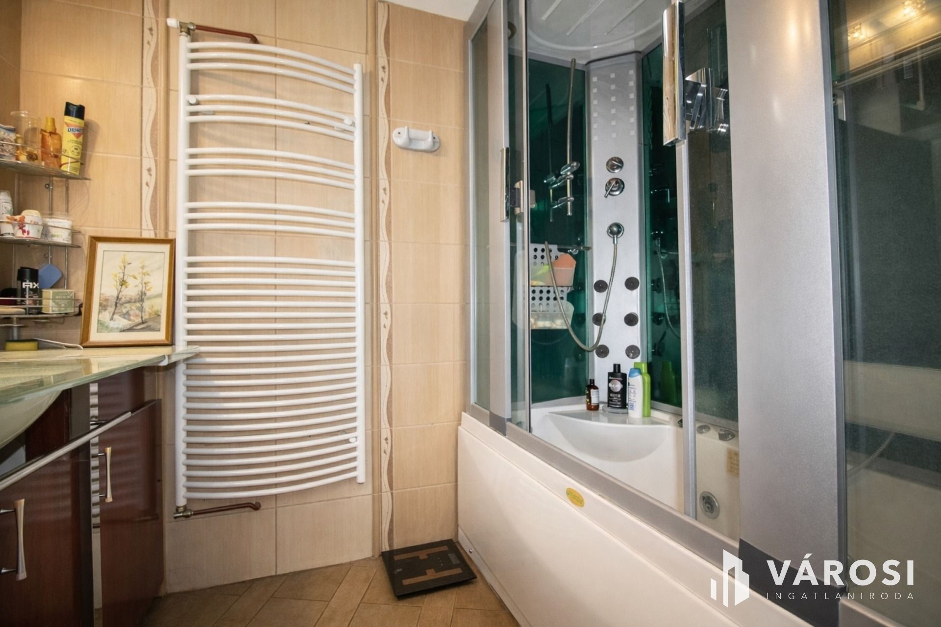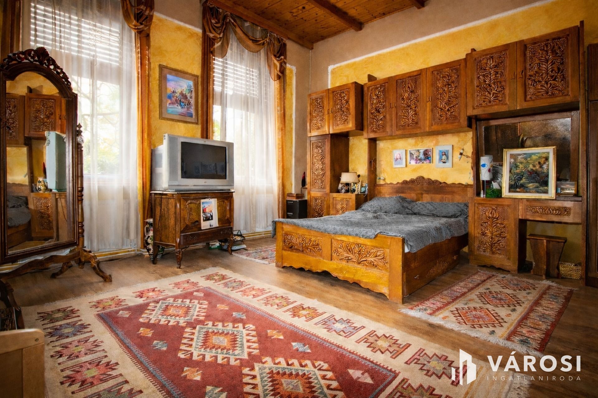 Az ingatlan egyik legnagyobb értéke a korhűen megőrzött, díszes, L alakú, fedett veranda, amely közel 40 négyzetméteren ad elegáns érkezést és klasszikus polgári hangulatot. A belső terek tágasak, jól átláthatók, a 195 négyzetméteres lakótérben minden helyiség nagyvonalúan méretezett. A ház két bejárattal rendelkezik, az utcafront felől pedig egy épületen belüli, 18,5 négyzetméteres, elektromos kapuval felszerelt garázs nyílik, amely közvetlen kapcsolatban áll az előszobával – ez a belvárosban, nagypolgári ingatlanoknál különösen ritka és rendkívül kényelmes megoldás.