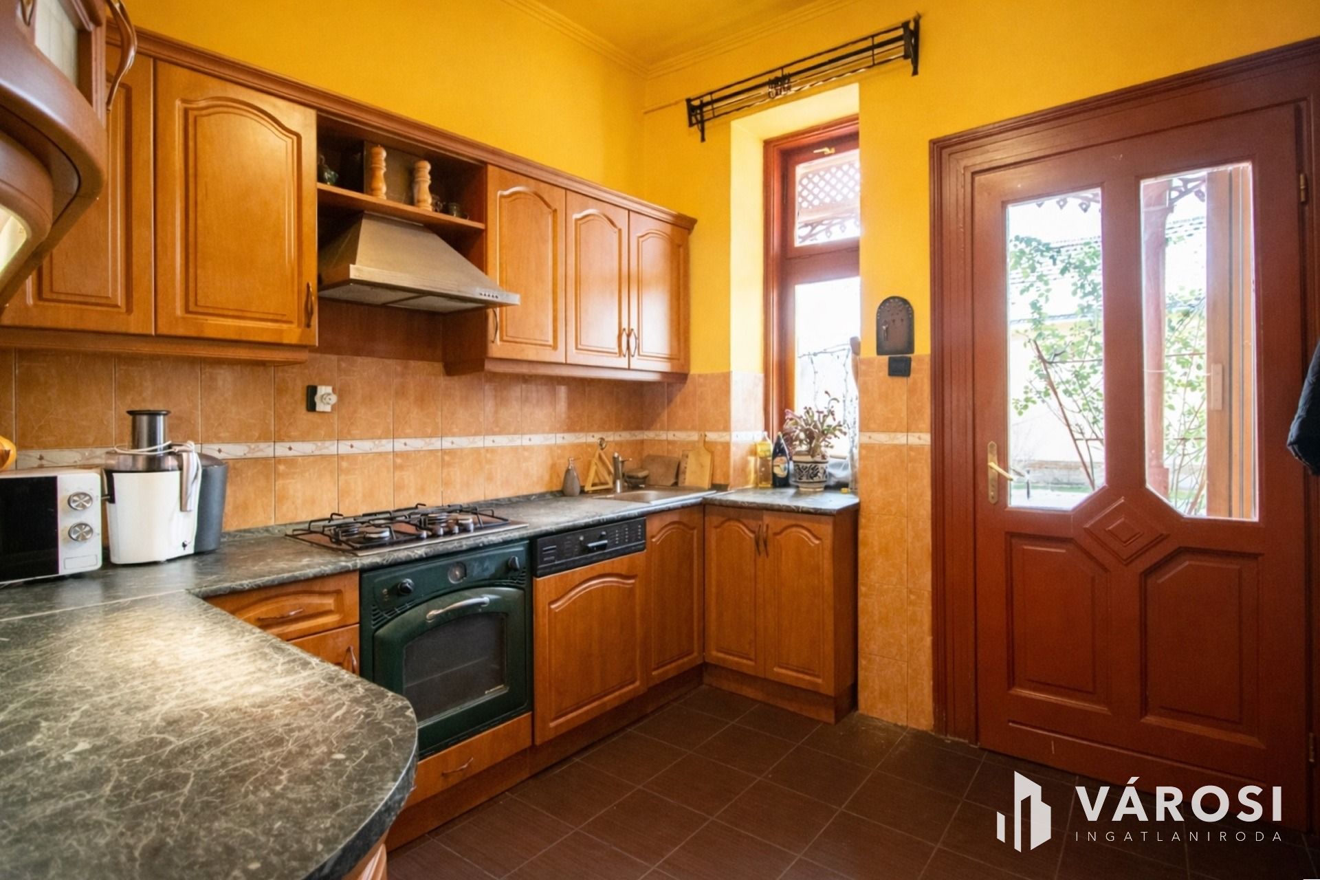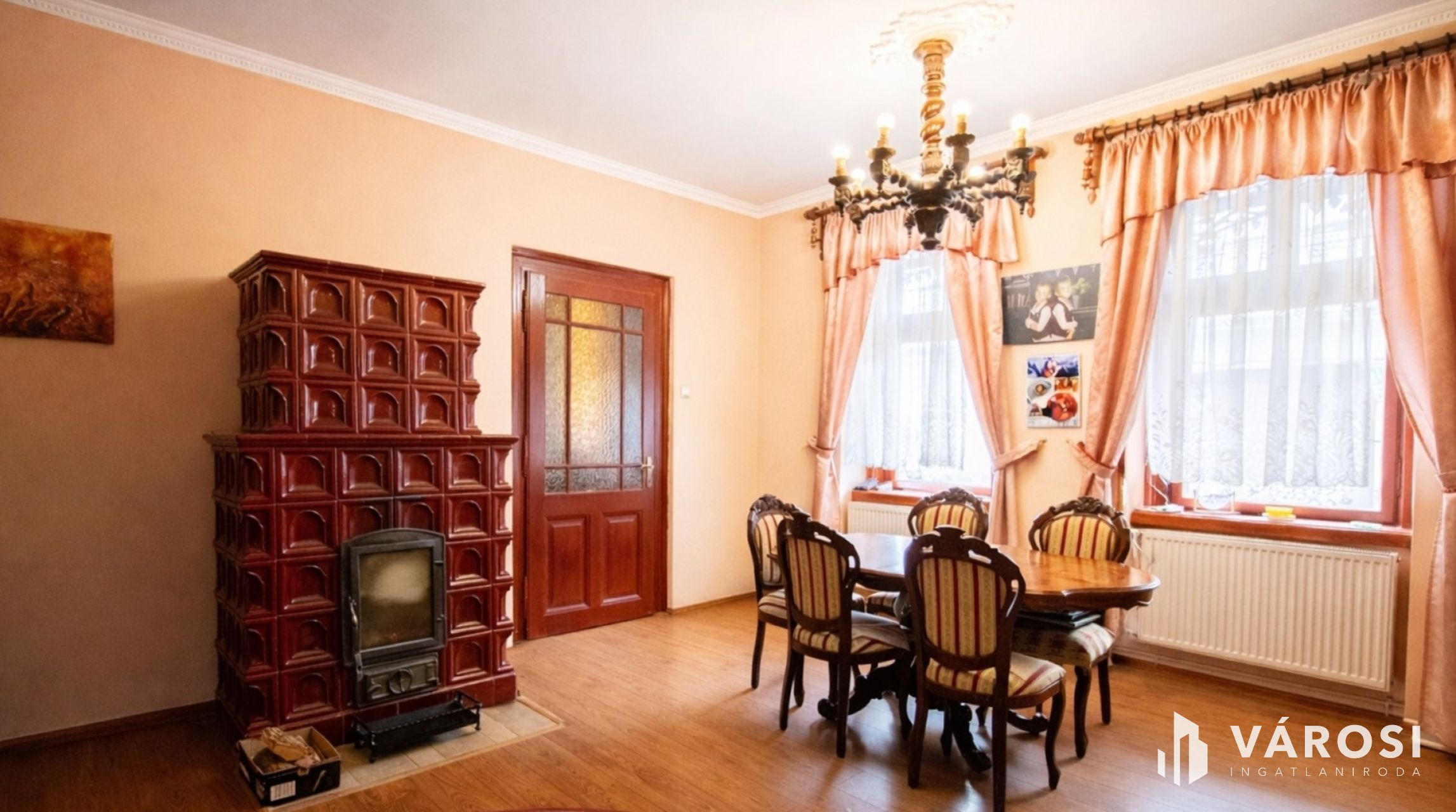 A nappali igazi ékköve a gyönyörű, pados csempekályha, amely nemcsak fűt, hanem meghatározza az egész tér hangulatát. Ugyanez a látvány visszaköszön az egyik utcai szobában és a konyha–étkezőben is, ahol egy extra méretű betöltőablakon keresztül figyelhető a tűz játéka, valódi, megismételhetetlen atmoszférát teremtve. A konyha és a fürdő már a modern igényeket szolgálja ki, miközben a nappali és a szobák berendezései, bútorai korhűek, elegánsak, és az egész házban következetesen őrzik a nagypolgári karaktert.