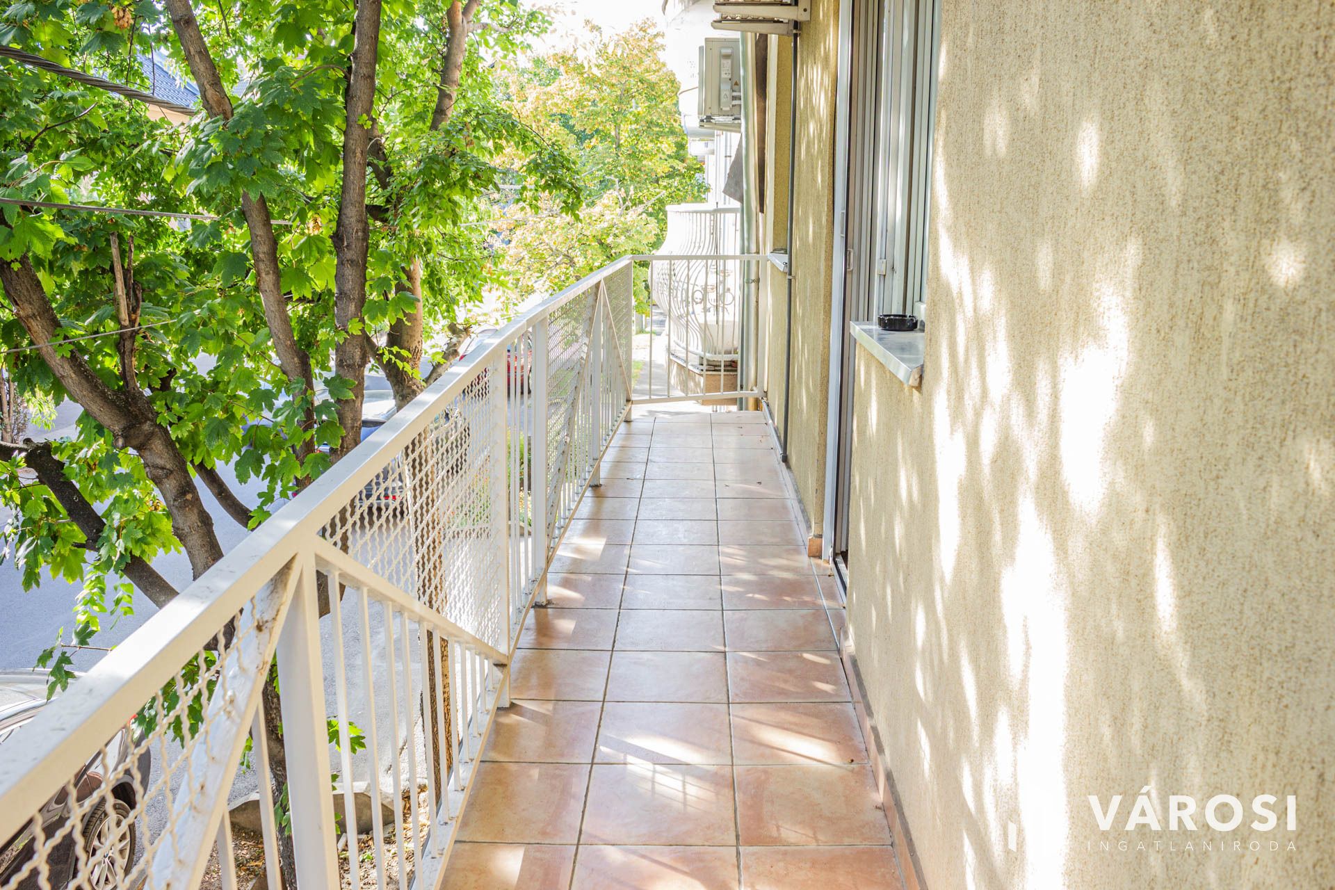 A tágas nappaliból egy erkélyre léphetünk, ami az utcára enged kitekintést.