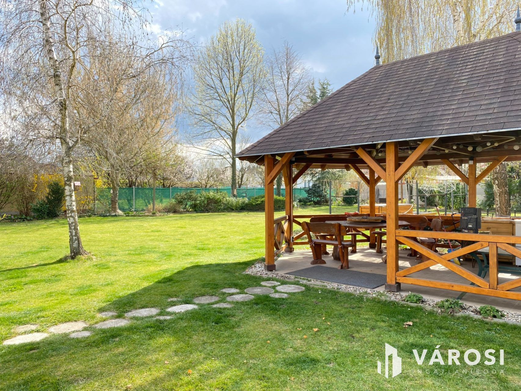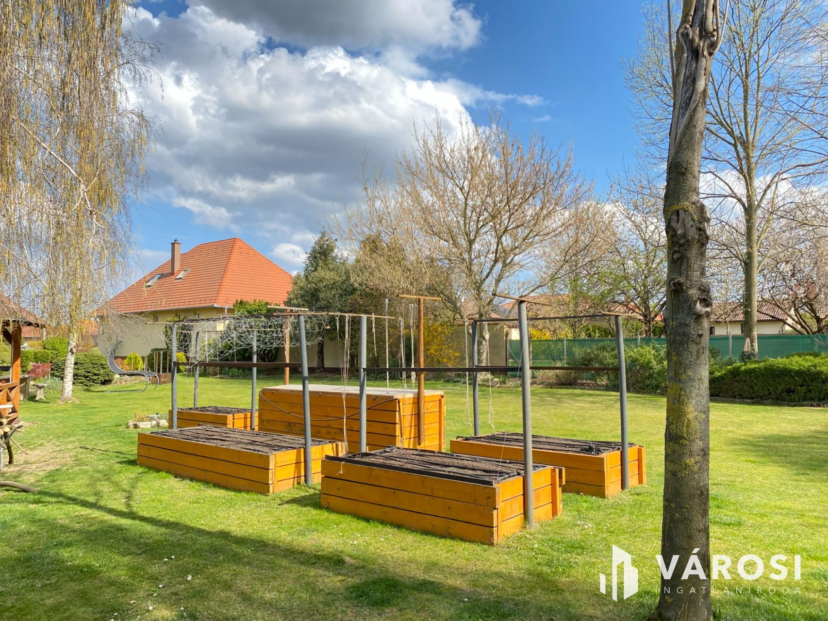 A szobák laminált parketta, a többi helység kerámia burkolatokkal rendelkezik. A házhoz egy nagy, kerámialappal burkolt terasz kapcsolódik, amely közvetlen kapcsolatot teremt a kerttel, emellett praktikus és pihenésre is alkalmas. Automata öntözőrendszer, kerti pavilon, szerszámtároló, bográcsozási lehetőség és magaságyások is kialakításra kerültek. A teljes terület parkosított, rendezett.