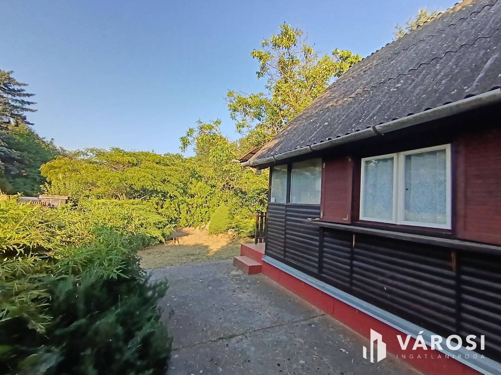 A telek körbekeritett, fákkal beültetett.